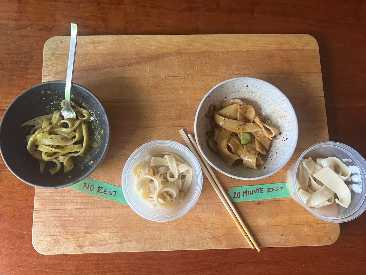 I made two versions of what I’ve been calling “lazy noodles” side by side: one where I let the dough rest for 20 minutes, and the other where I rolled it out immediately after kneading. While the rested dough is slightly easier to stretch, if there’s a difference in the final taste and texture, I have no idea what it is. So, that’s that: lazy, un-rested, ragged, inelegant, flippant, incredibly enjoyable homemade wheat noodles in ten-ish minutes. Video and recipe below.